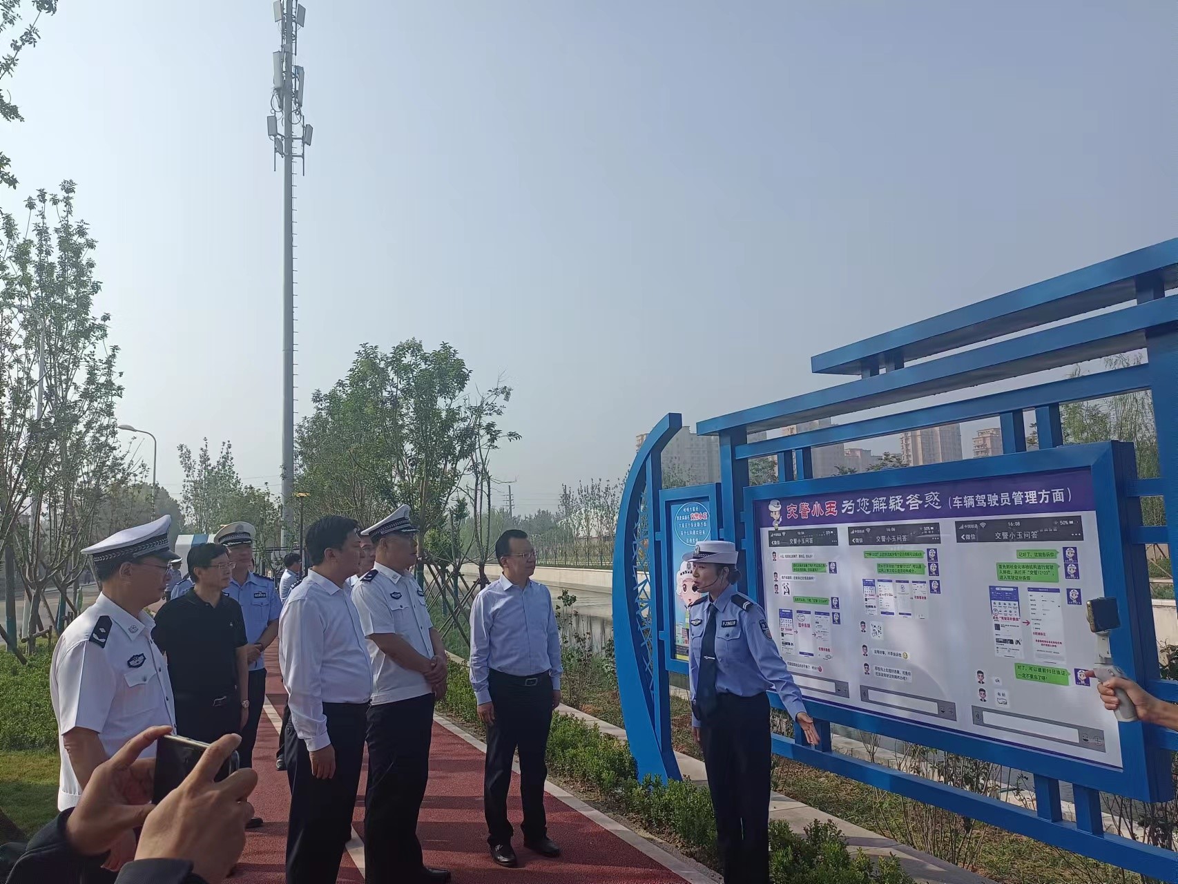 我们可以看到在绿道两侧分别设立:道路交通安全法相关法律规定、车辆驾驶管理方面解疑答惑知识和“酒后驾车”危害性介绍、“闯红灯”“酒驾”“电动车违法”等展示牌,在绿道尽头设置了“122”主题图案和交警卡通人物,智慧交通展示区、交通安全涂鸦创作区、“122讲台”宣教区、“车辆标识标牌”科普区、党建品牌展示区、道路交通事故自行协商区、“交警小玉”问答区、路口交通信号和电子警察展示区十几个主题区域,让群众漫步在交通安全主题小道中,既学习了交通法规知识,了解“一盔一带”重要性和“酒后驾车”危害性,提升交通安全意识和文明礼让素养,打造出群众乐于参观、流连观看、提升交通安全意识的交通安全主题公园。